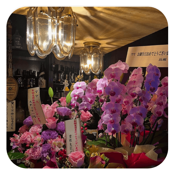 キャストは約10名、20代から40代まで幅広い層が揃い、男性マネージャーも在籍。コロナ禍を経て若い世代のキャストが増え、より活気のある空気が広がっています。40年働いたベテランキャストもいたほど定着率が高く、ママとキャストの絆が深いのも特徴です。お客様と結婚したキャストがかつて5人もいたというエピソードも心温まります