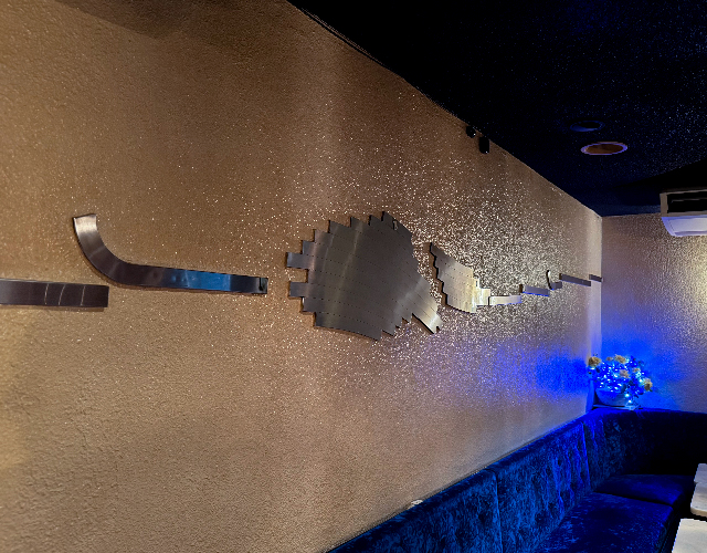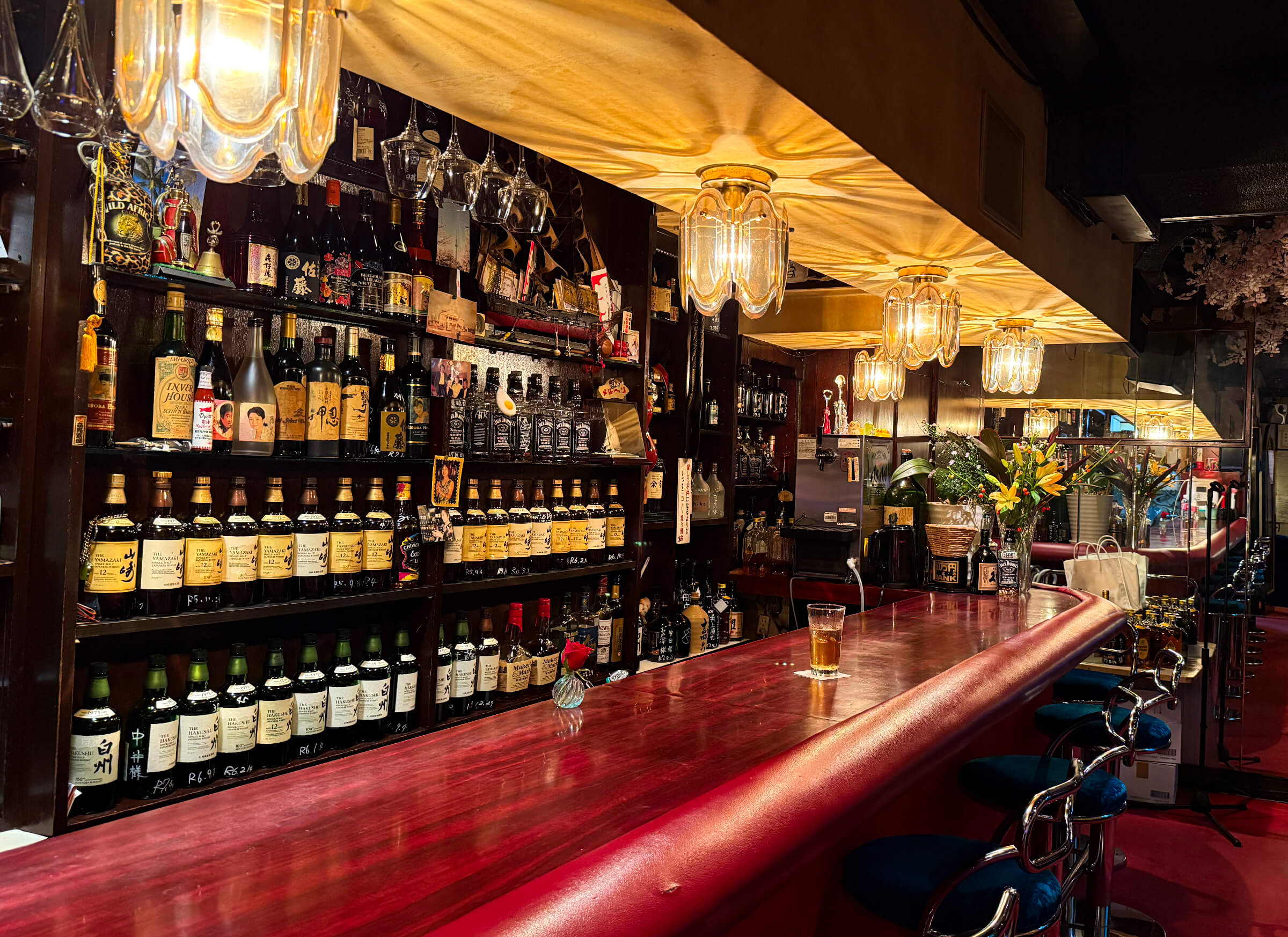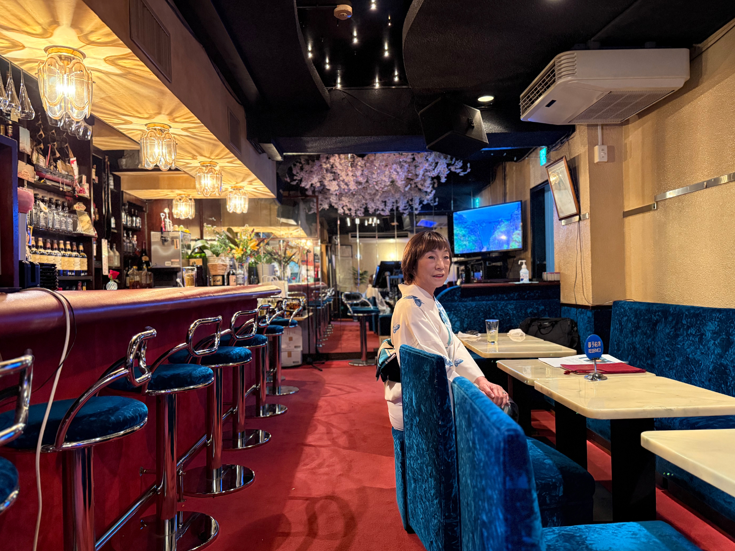 店名「メルヘン」には、「少女の頃の夢や憧れを忘れずに」という想いが込められています。オープン当初は赤い衣装に帽子という“メルヘンチック”な装いでお客様を迎えたそう。店内は雲や川、木々に囲まれたようなデザインで、春は桜、秋は紅葉を思わせる雰囲気。まさに昭和から続く「夢を見る大人の社交場」として二子玉川の夜を彩ってきました。